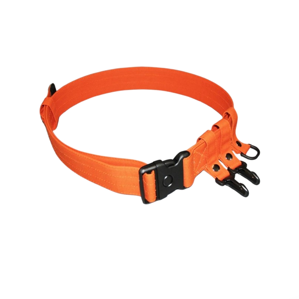 Cinturone realizzato in tessuto ignifugo con striscia altezza 4 cm colore arancio. Robusta fibbia con sgancio rapido doppia sicurezza. Protezione fibbia in cuoio fiore. Completo di due passanti in tessuto ignifugo con moschettone ed un passante con anello. Regolabile da 100 cm a 120 cm. Peso kg. 0,34