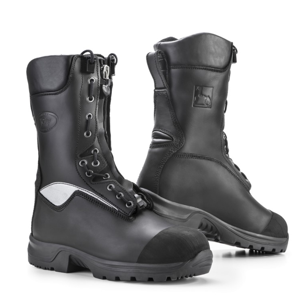 Stivale tecnico antincendio certificato CE secondo EN 15090:2012 F2A HI3 CI SRC – D.P.I. III Categoria. Caratteristiche principali: Tomaia: Pelle bovina pieno fiore, idrorepellente, spessore 2,0–2,2 mm Collarino: Pelle pieno fiore morbida, idrorepellente, spessore 1,0–1,1 mm Fodera: Tessuto Cambrelle® (100% PA), traspirante Puntale: Alluminio asimmetrico, resistente a 200 J (EN 12568:2010), con protezione superiore morbida Contrafforte: Fibra sintetica con resine termoadesive Copripunta esterno: Gomma speciale antiurto e antiabrasione, sp. 1,8 mm Cerniera: Sistema di sfilamento rapido, divisibile, con protezione in pelle Filo cuciture: Kevlar® ignifugo Occhielli: Ottone brunito antiruggine Lacci: Nomex®, ignifughi e idrorepellenti, con fermalacci a molla Plantare: Anatomico, feltro assorbente + rivestimento TNT antiabrasione, inserto EVA per comfort Sottopiede: Antiperforazione Zero mm (tessuto composito, EN 12568:2010), con rinforzo plastico Suola: Gomma nitrilica antiscivolo SRC, resistente a 300 °C, antiolio, antistatica, con battistrada autopulente e struttura interna ammortizzante a nido d’ape Dati tecnici: Peso (paio – taglia 42): ca. 2330 g Altezza posteriore: ca. 30 cm (con suola) Taglie disponibili: 36–49 (50–51 su richiesta)